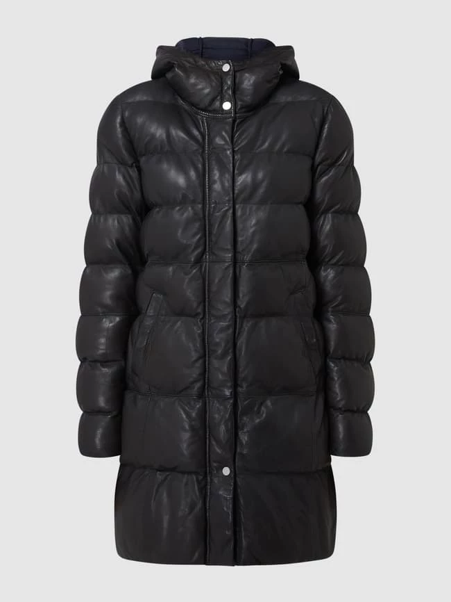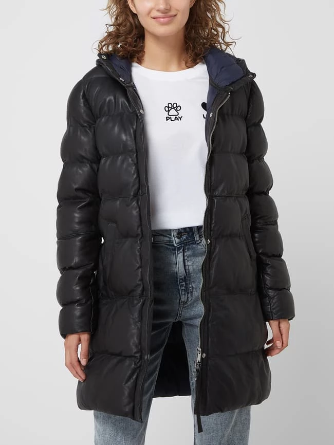 Der Steppmantel von Freaky Nation ist aus echtem Leder gefertigt und tailliert geschnitten. Er zeigt sich mit Kapuze, Zweiwege-Reißverschluss und Wattierung.