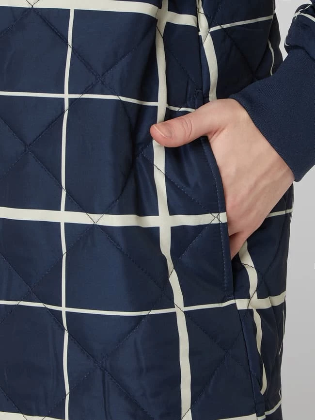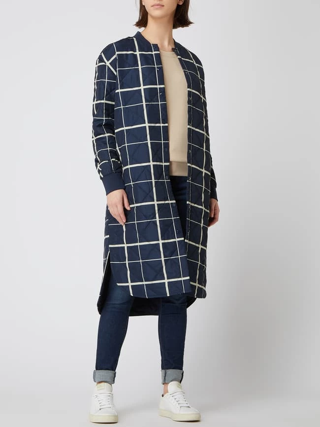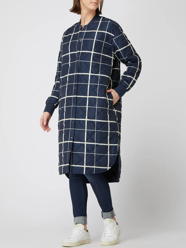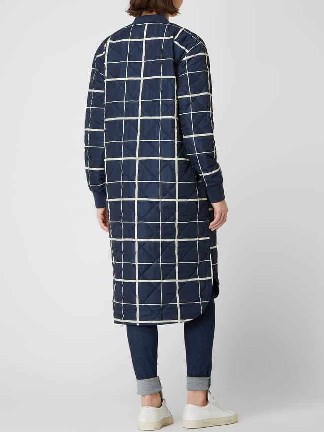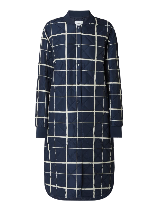 Der Steppmantel von Moss Copenhagen ist aus strapazierfähigem Material mit recyceltem Anteil gefertigt. Er kommt in lockerer Passform mit Gitterkaro, Eingrifftaschen und Wattierung.