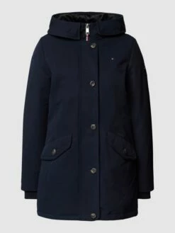 Der Mantel von s.Oliver BLACK LABEL ist aus einem strapazierfähigen Material gefertigt und gerade geschnitten. Er zeigt sich mit Kapuze, sowie Knopfleiste und Reißverschluss.
